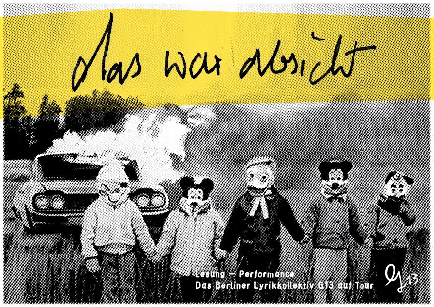 Ein Jahr nach der Veröffentlichung unserer Anthologie „40 % Paradies“ haben wir unseren ersten kollektiven Text verfasst: „das war absicht“. Ein Cut daraus ist bereits in der Bella Triste 36 erschienen, nun liegt der ganze Text als Heft bei SuKuLTuR vor. Damit gehen wir auf unsere vierte Lesetour. Beim Schreiben wurde die Auflösung und Wiedereinführung einzelner Stimmen zum Verfahren, etwas Ähnliches wird auf der Bühne geschehen. Sechs Mal gibt es die Gelegenheit, uns zu sehen: